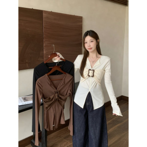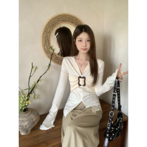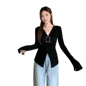肥柒柒大码美式辣妹复古设计感V领针织衫女开衩百搭修身喇叭袖