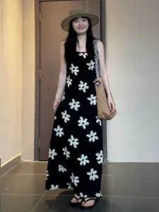 法式海边度假黑色吊带碎花连衣裙子女夏季2025新款小个子气质长裙