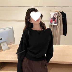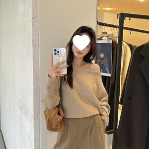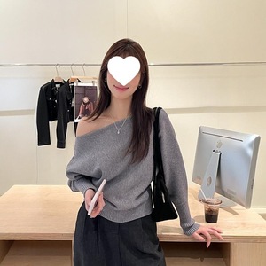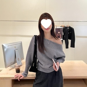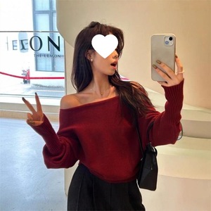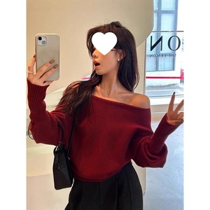 卡其色不规则气质一字领露肩针织衫女秋冬洋气别致毛衣宽松上衣女