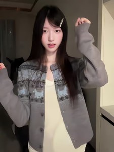 灰色韩系氛围感早秋季软糯提花开衫毛衣外套女复古针织衫外搭上衣