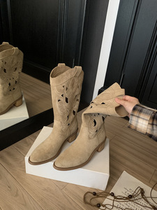 牛皮版~葡萄妈尖头镂空刺绣西部牛仔靴女中短筒粗跟棕色骑士靴子