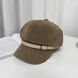韩版气质复古绒面八角帽子女英伦风秋冬时尚皮带扣显脸小报童帽