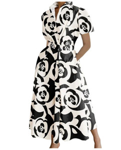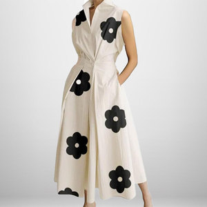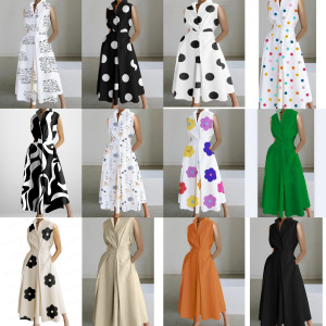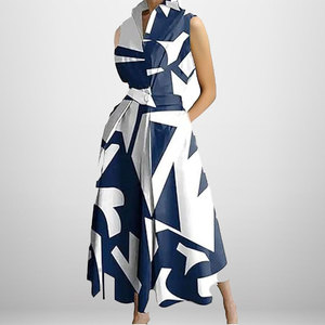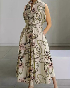 跨境欧美时尚休闲无袖V领大摆潮流纯色印花女装通勤高贵连衣裙