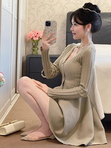 法式高级感V领针织连衣裙子女早秋季2025年新款小个子收腰a字短裙