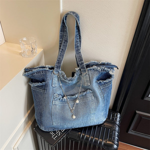 韩系复古托特包大容量松弛休闲牛仔布包舒适耐磨百搭通勤单肩包