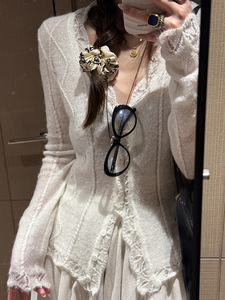 白色V领花边长袖开衫上衣2025早秋新款马海毛轻薄款针织打底衫