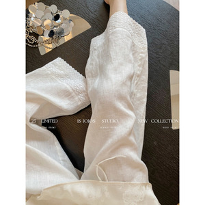 白色刺绣花边拼接亚麻休闲裤女夏2025新款宽松慵懒气质显瘦阔腿裤