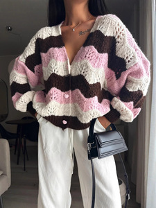 跨境亚马逊秋冬热销新款波浪纹撞色V领长袖单排扣针织开衫毛衣女