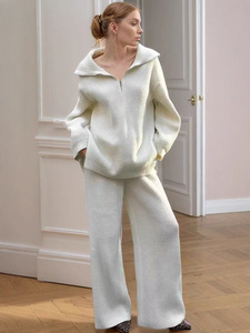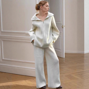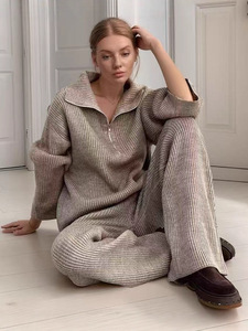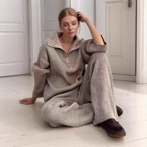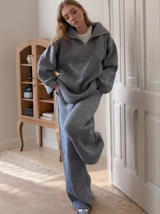 跨境半拉链针织毛衣套装女欧美2025秋冬新款翻领长袖阔腿长裤套装