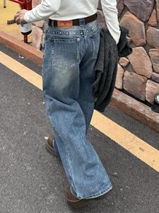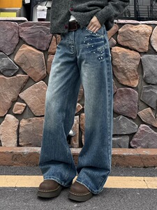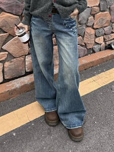 美式复古铆钉低腰阔腿牛仔裤男女款高街设计感宽松休闲显瘦直筒裤