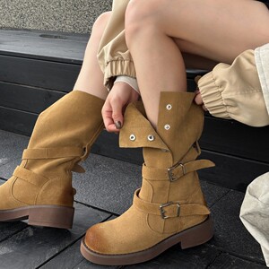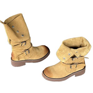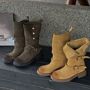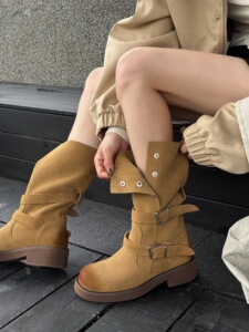 2025秋季新款废土风复古圆头粗跟翻领筒擦色牛反绒皮西部短靴女靴