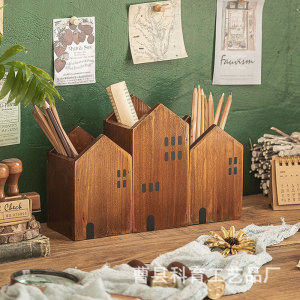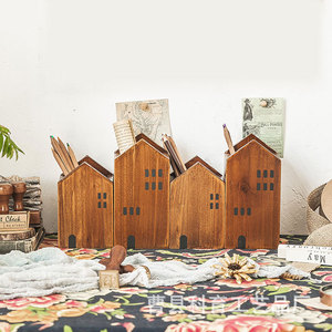 日式复古木制笔筒桌面创意摆件实木笔筒化妆刷桶办公室桌面收纳盒