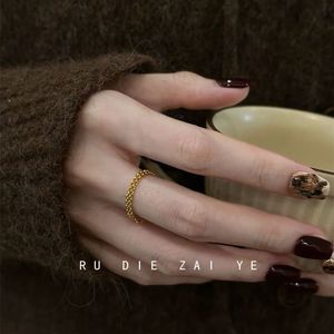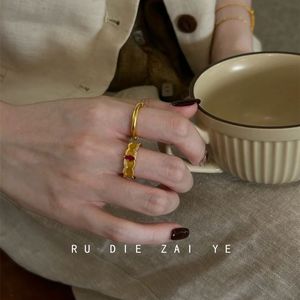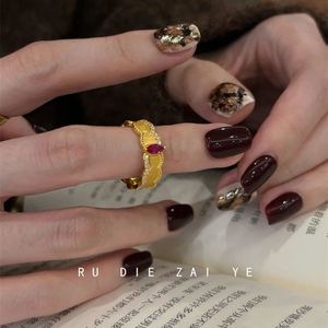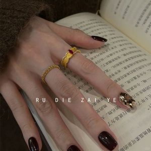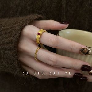 库宁 Vintage复古红锆石拉丝开口戒轻奢高级感双层抽拉素链戒指