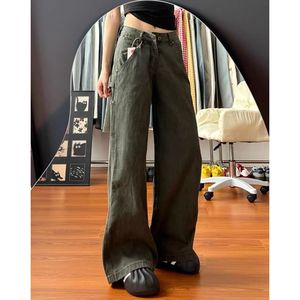 美式复古加长军绿色工装牛仔裤女新款高腰宽松阔腿显瘦直筒拖地裤