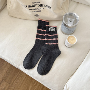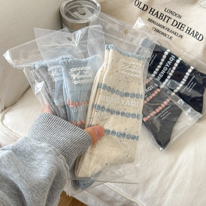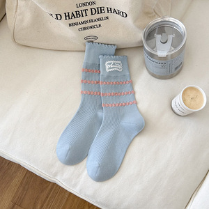 字母蕾丝布标袜子女韩系中筒袜精梳棉吸汗木耳边堆堆袜女无骨袜子