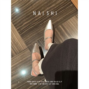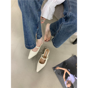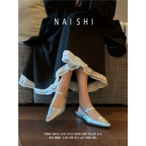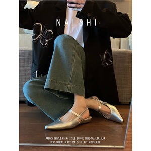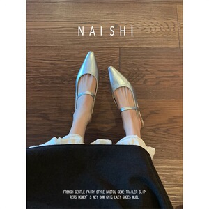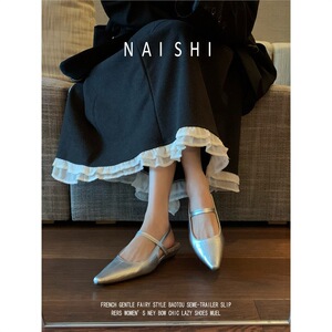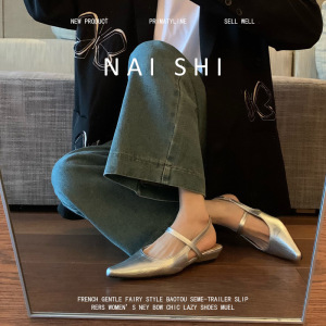 羊皮版!银色尖头包头凉鞋坡跟一字带设计感法式单鞋小众低跟瓢鞋