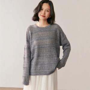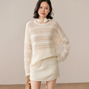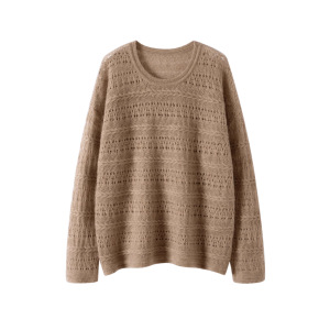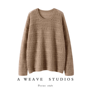 25秋冬新款山羊绒衫女圆领镂空钩花宽松长袖针织衫毛衣打底衫上衣