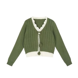 法式复古假两件显瘦V领针织衫女春秋小众时尚系带毛织上衣
