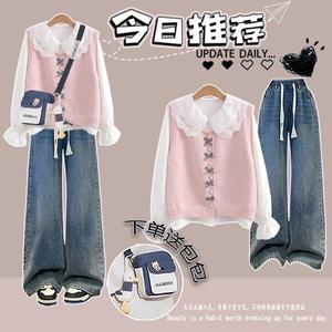 粉马甲+娃娃领衬衫+牛仔裤1送包 9007