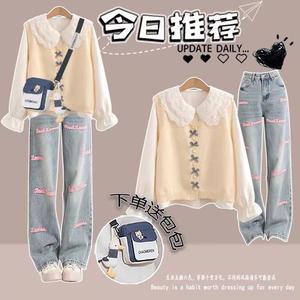 米白马甲+双花瓣领衬衫+牛仔裤1送包 9007