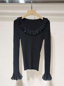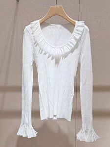 轻奢上衣2025早秋季新款荷叶边圆领长袖白色显瘦气质打底针织衫女