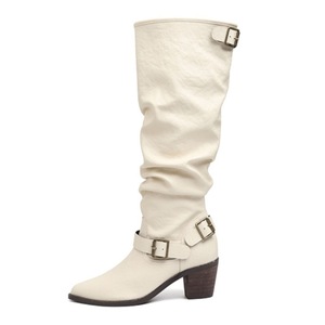 MuXuan~ 尖头粗跟白色长靴新款英伦风皮带扣骑士靴气质高筒堆堆靴