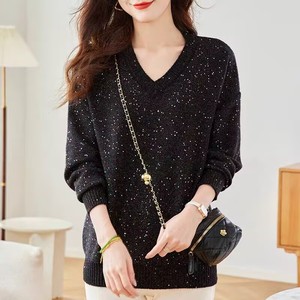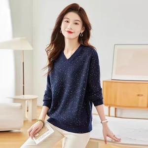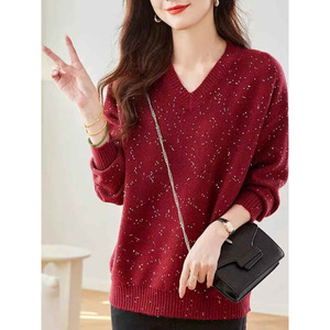 安哥拉红高端V领亮闪闪毛衣上衣打底衫女秋冬慵懒风可外穿针织衫