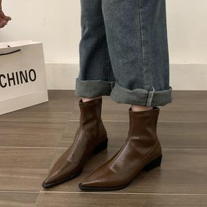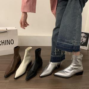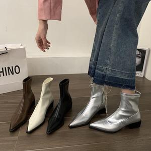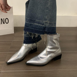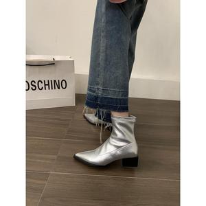 女鞋法式时尚粗跟短靴女鞋2025年新款春秋季单靴尖头银色气质瘦瘦