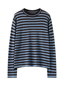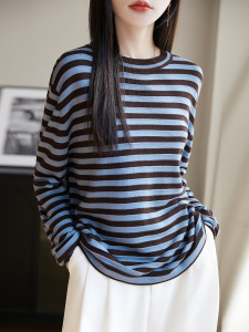 松弛感圆领针织衫女撞色条纹t恤长袖打底衫宽松2025春季新款上衣