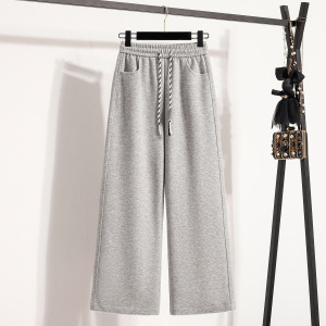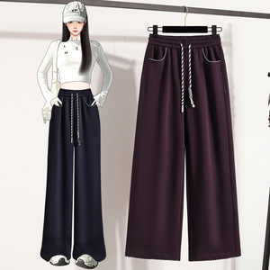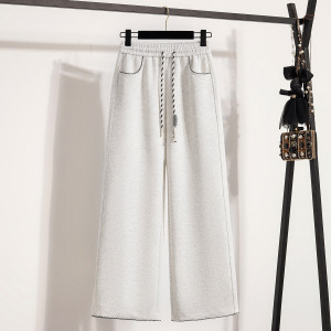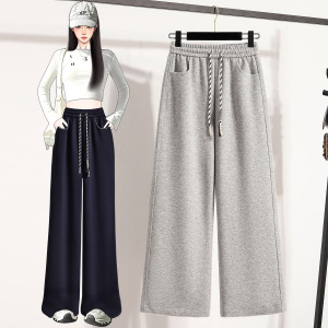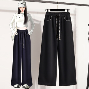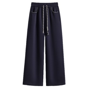 秋季新款花边撞色直筒卫裤女松紧高腰显瘦简约休闲百搭阔腿运动裤