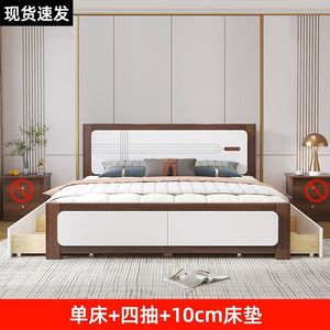 【板材加粗】胡桃款实木床+10CM垫+四抽