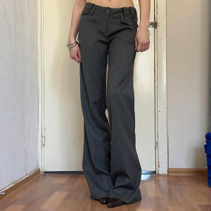 2025早春美式休闲风条纹低腰微喇裤腰头不对称拼接设计辣妹西装裤