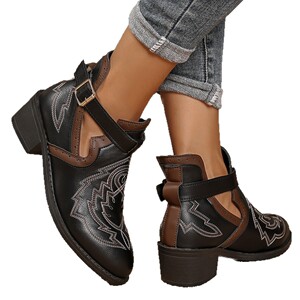 跨境外贸大码秋季女式皮带扣马丁靴复古尖头粗跟刺绣民族风女靴子