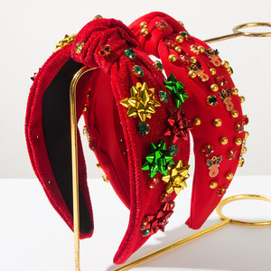 新款圣诞节发箍红绿色塑料花小鹿配件镶钻头箍女简约韩版节日发饰