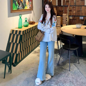 韩版时尚设计感V领刺绣民族风长袖上衣高级感休闲花朵甜美慵懒风