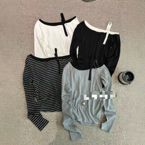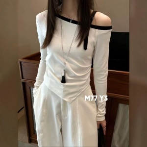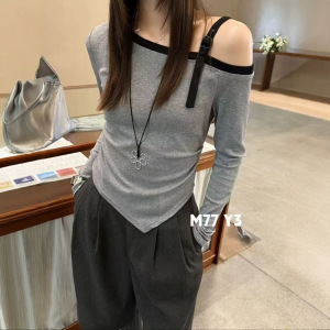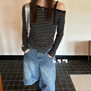 辣妹风斜肩条纹长袖2025年秋季新款锁骨露肩修身打底长袖衫A9868