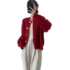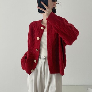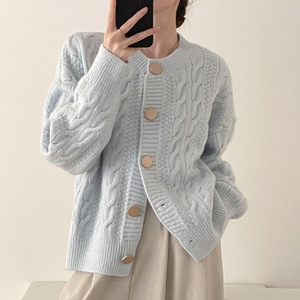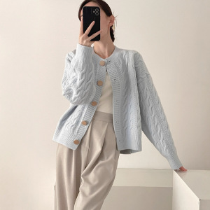 设计感金扣纯色单排扣宽松麻花扭绳长袖毛衣针织外套秋冬百搭上衣
