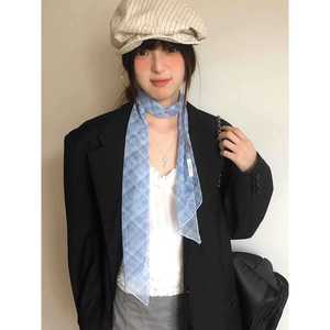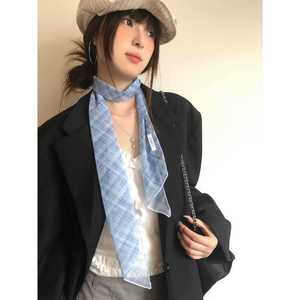 韩系高级感蓝色格纹丝巾女长条薄款网纱系脖围巾百搭领巾飘带配饰
