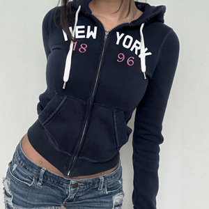美式复古字母印花抽绳卫衣拉链连帽休闲外套女2025秋冬新款上衣潮