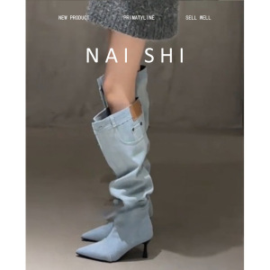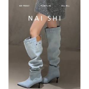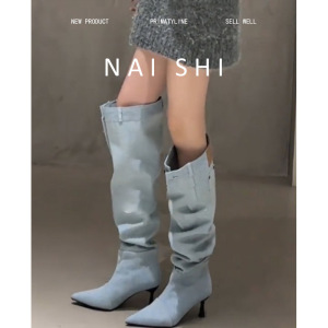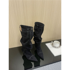羊皮版!辣妹尖头长靴女细跟设计感牛仔堆堆靴大筒围高跟骑士靴