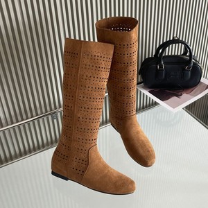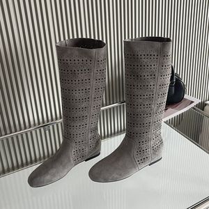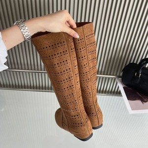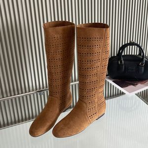 镂空平底长靴女2025新款小个子不过膝高筒靴西部牛仔靴英伦骑士靴