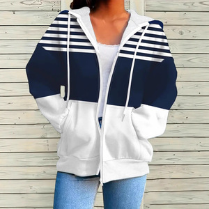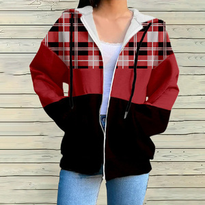 秋冬外套优雅时尚休闲宽松开衫带口袋格子拼接拉链连帽衫大码女