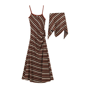 【COMOS CMS】2025法式复古斜条纹方巾A字吊带裙气质长裙CM255101