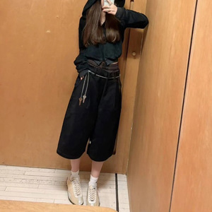 2025夏季新款小众拼色双腰头拼接牛仔裤宽松阔腿七分裤女