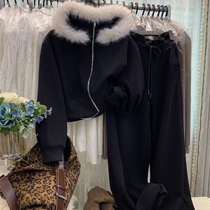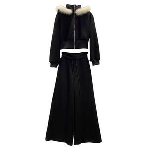 韩系灰加绒卫衣套装女秋冬新款毛领连帽拉链外套阔腿裤两件套