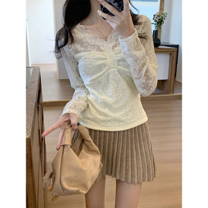 内里蕾丝印花v领打底衫女秋冬季高级感修身外穿内搭上衣长袖T恤潮