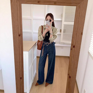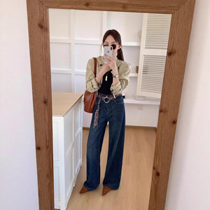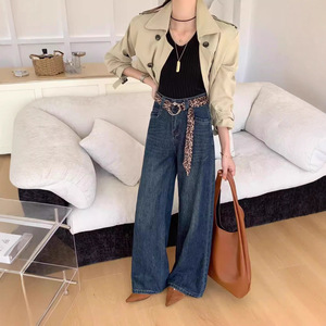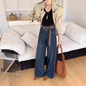 初秋时尚复古蓝色高腰宽松显瘦拖地直筒裤子阔腿豹纹腰带牛仔裤女