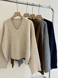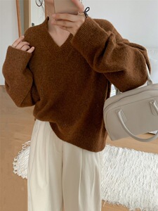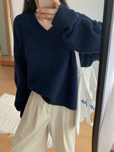 慵懒风纯色V领套头毛衣女秋冬新款宽松显瘦百搭软糯针织衫上衣潮