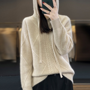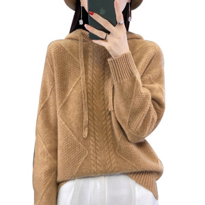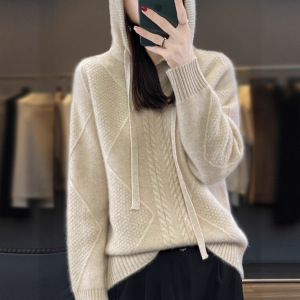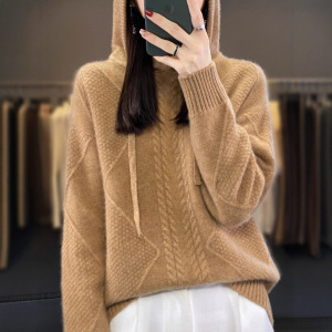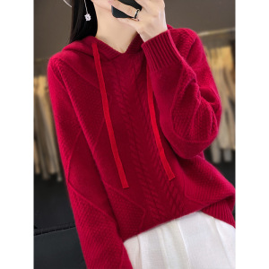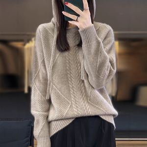 秋冬新款连帽套头长袖针织绞八花韩版宽松休闲短款纯色简约毛衣女