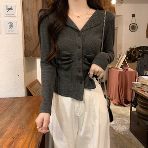 polo领褶皱长袖T恤女春秋薄款正肩修身外穿打底衫辣妹设计感上衣